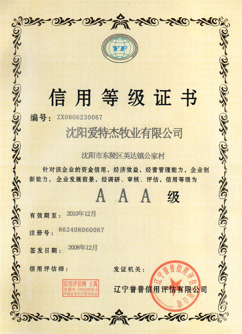 10年遼寧省飼料工業(yè)協(xié)會副會長單位(獎..