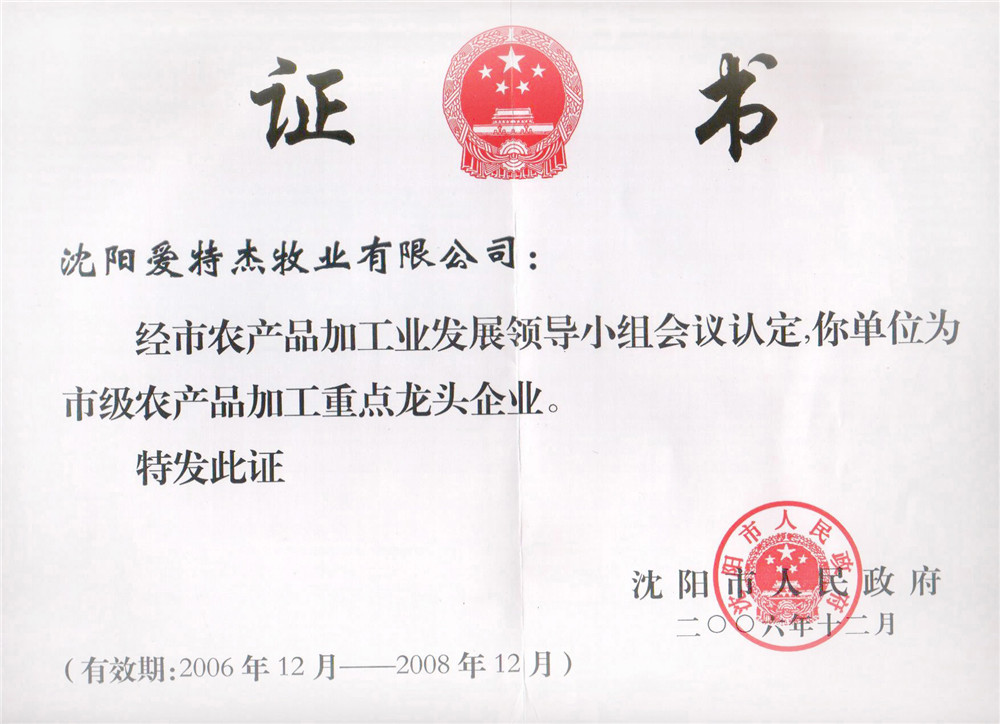06年市級農(nóng)產(chǎn)品加工重點(diǎn)龍頭企業(yè)(獎牌)